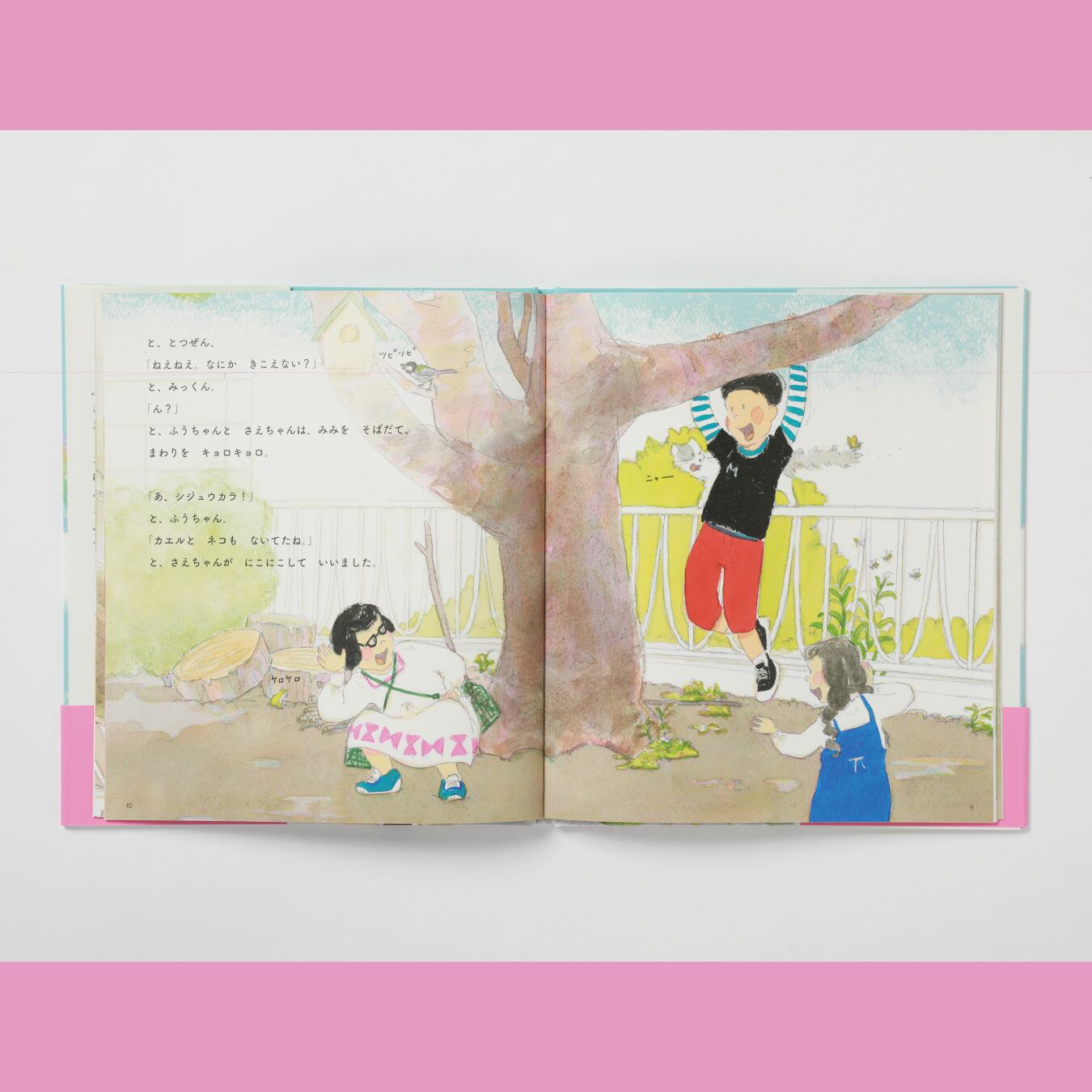 ふうちゃんはかくれんぼ、さえちゃんは虫探し、みっくんはきのぼりを提案するけれど、なかなか決まりません。